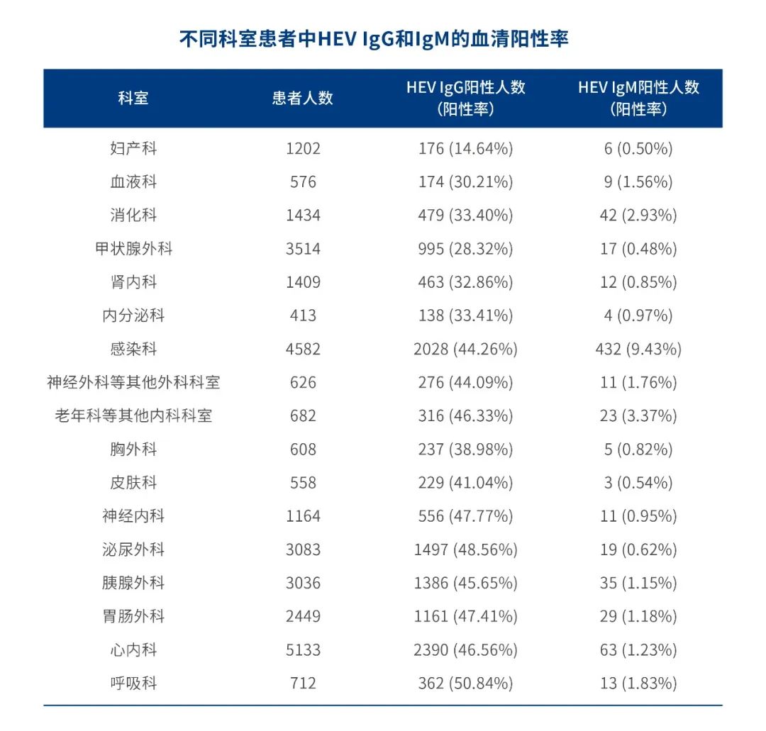 来自瑞金医院的大样本研究证明,HEV IgG抗体(HEV既往感染标志物)和HEV IgM抗体(HEV现证感染标志物)的总体血清阳性率分别为41.25%和2.35%,提示我国HEV感染疾病负担沉重,需要重视戊型肝炎的筛查与防控工作。