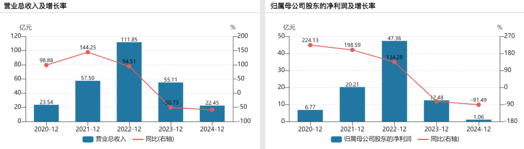 2022年后,公司业绩却急转直下,2023年营收同比下滑超50%至55.11亿元,2024年进一步大幅萎缩至22.45亿元,同比降幅扩大至59%;同期归母净利润骤降至1.06亿元,降幅高达91%。
