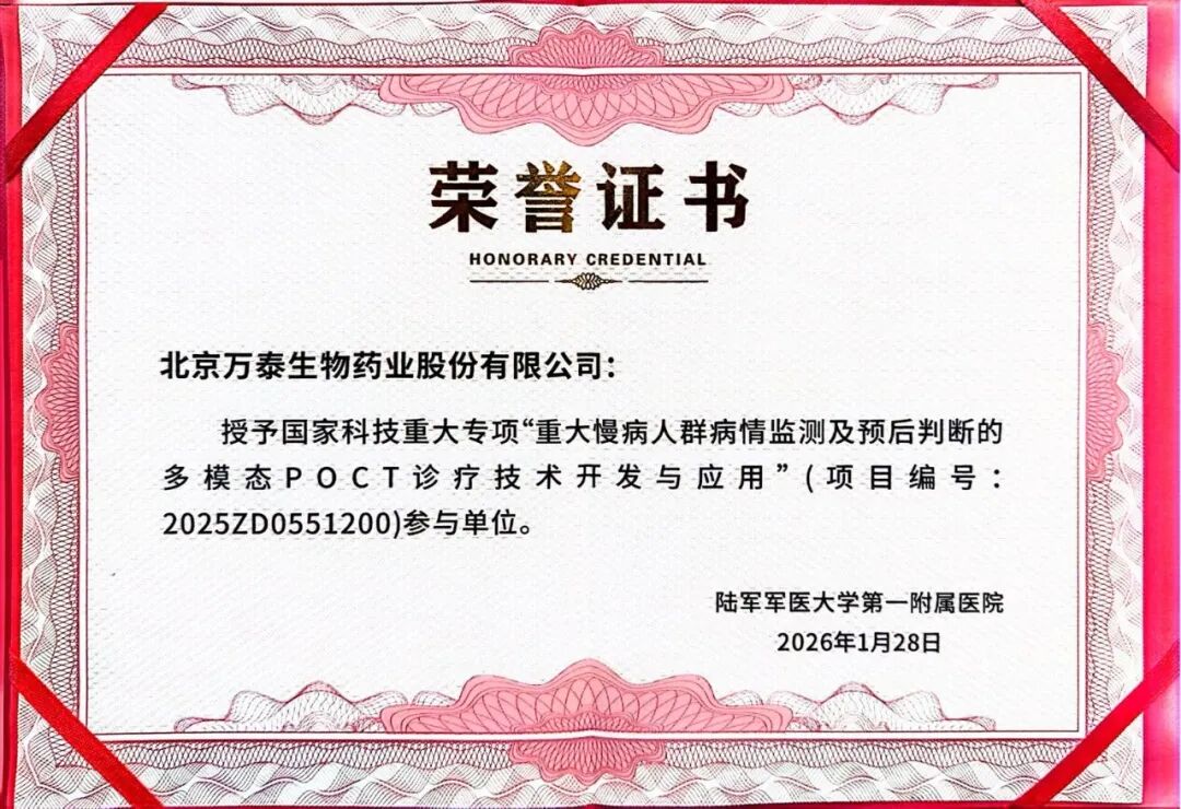 万泰生物依托在体外诊断试剂与仪器研发方面的扎实积累,承担本重大专项中的关键技术研制任务,致力于实现检测过程的快速化、精准化与便携化,助力提升基层医疗与社区的慢病管理能力。通过承担这一国家重大专项的关键技术任务,万泰生物将持续发挥在生物标志物发现、试剂工艺开发、系统集成验证等方面的综合优势,推动多模态POCT技术从平台建立到临床评价的全链条落地,为我国重大慢病防控提供具备自主知识产权的新工具与新方案。