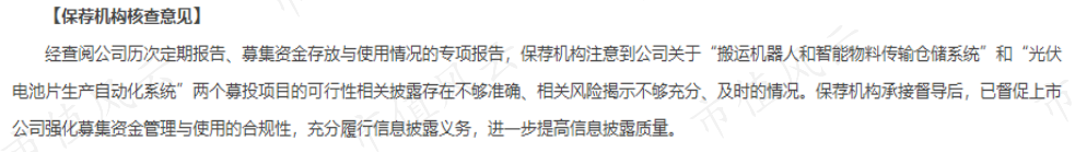 2017年,公司首发上市募集3.3亿。其中,“搬运机器人和智能物料传输仓储系统项目”和“光伏电池片生产自动化系统项目”未能如期开展,共计约1.5亿募集资金长期在银行做理财。
