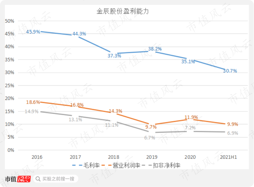 2020年,公司的营业利润率仅为11.9%,扣非净利率仅为6.9%。上市四年,扣非净利润率跌去近一半。