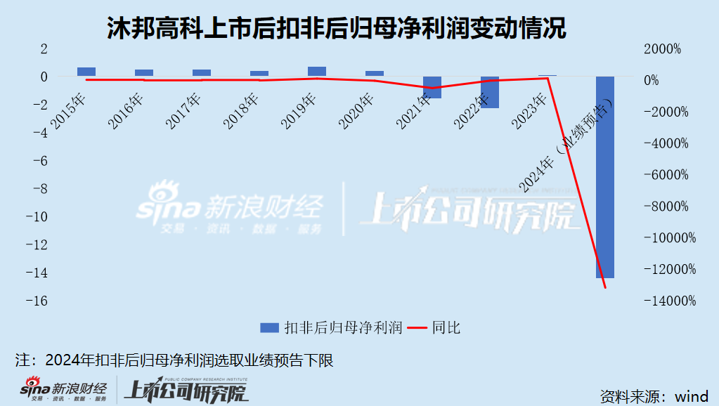 沐邦高科面临的困境不止于此。业绩预告显示,公司2024年预计净亏损4.2亿元到5.2亿元,扣非后净亏损11.7亿元到14.4亿元,创下上市以来最大亏损的记录。