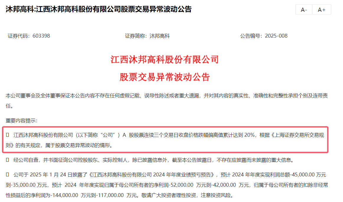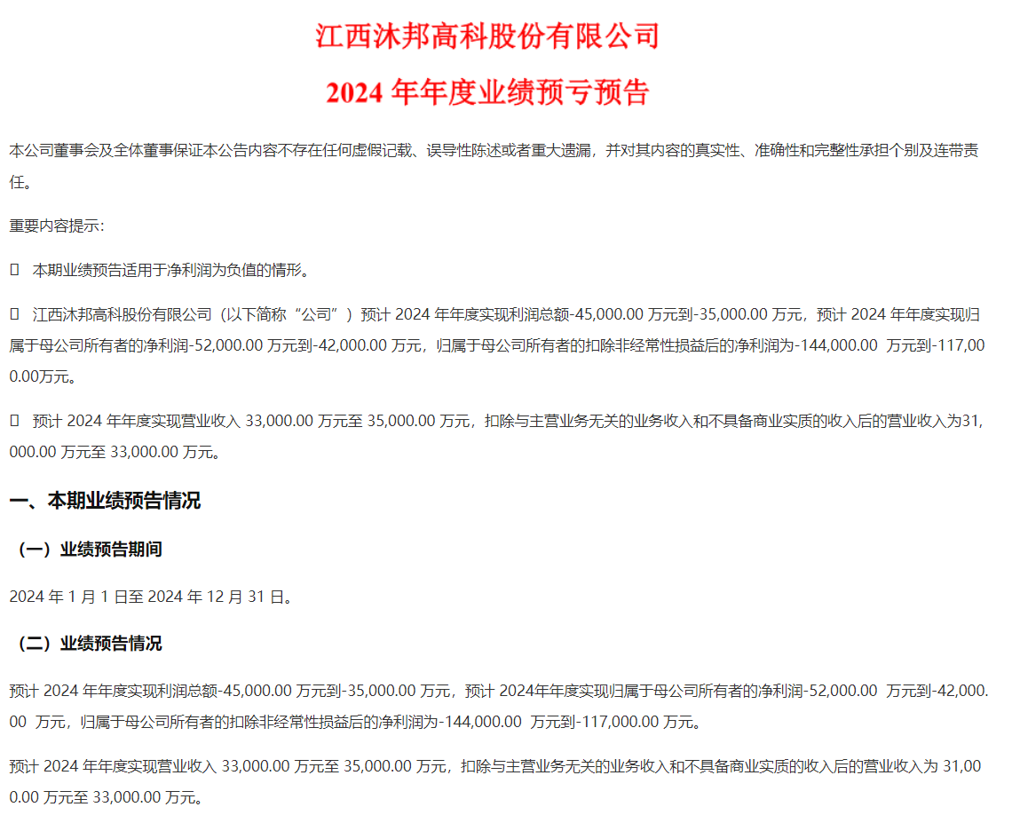 然而,资金冻结只是沐邦高科面临的众多问题之一。更为严重的是,公司近期发布的业绩预告显示,2024年利润总额预计将亏损4.5亿元至3.5亿元,归母净利润更是预计亏损5.2亿元至4.2亿元,扣除非经常性损益后的净利润亏损额更是高达14.4亿元至11.7亿元。这一巨额亏损主要归因于光伏行业竞争的加剧和产业链价格的持续回落,导致公司盈利能力承压,单晶硅棒、硅片业务毛利率同比下降,存货跌价准备同比上升。