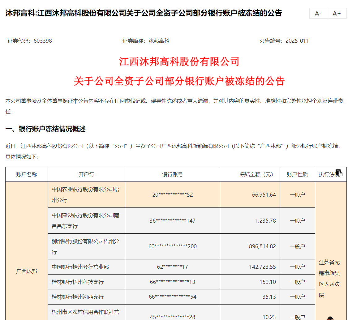 近日,光伏行业曾经的明星企业沐邦高科(603598.SH)发布公告称,其全资子公司广西沐邦高科新能源有限公司的部分银行账户遭遇冻结,涉及金额高达110.81万元。此次账户冻结事件源于无锡江松科技股份有限公司申请的案件执行,而这只是沐邦高科当前困境的冰山一角。