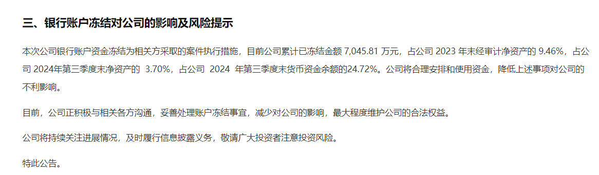 根据公告,沐邦高科目前累计被冻结金额已达到惊人的7045.81万元,这一数字分别占公司2023年末经审计净资产的9.46%、2024年第三季度末净资产的3.70%,以及2024年第三季度末货币资金余额的24.72%。面对如此严峻的资金状况,沐邦高科表示将积极应对,合理规划资金安排,力求将冻结带来的不利影响降至最低。