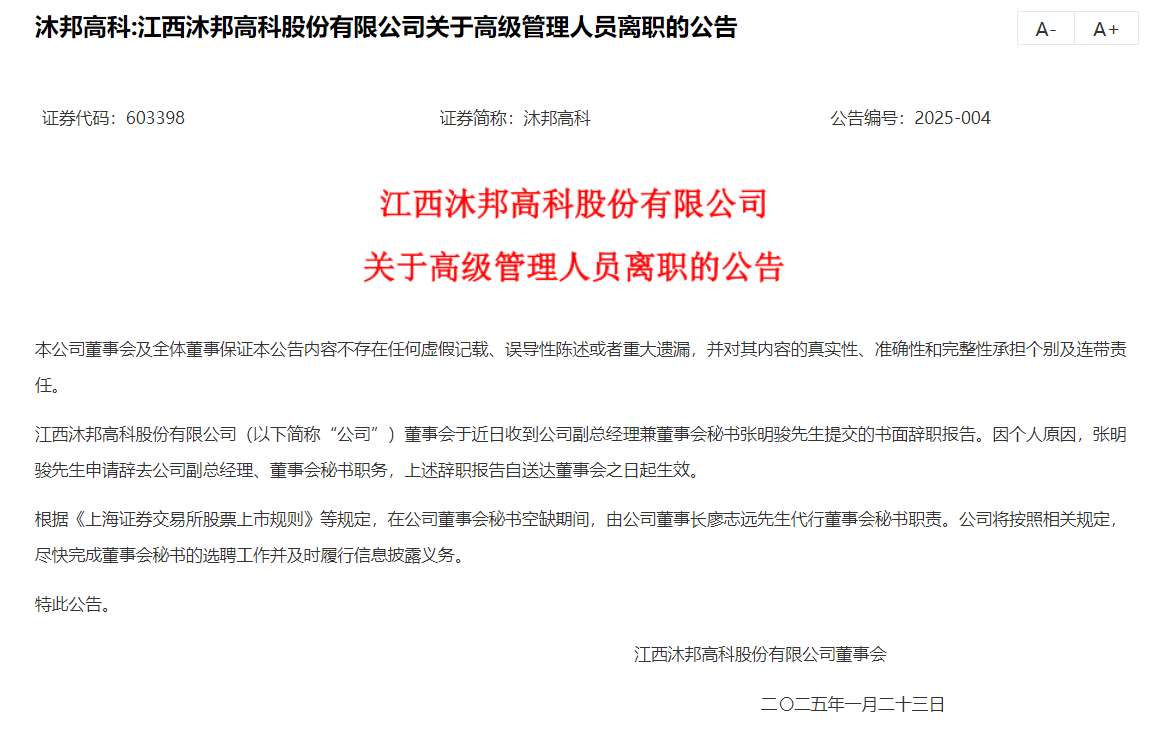 高管层面的变动也为公司的前景蒙上了一层阴影。近期,沐邦高科迎来了一波高管密集辞职潮,总经理、副总经理兼董秘相继辞职。业内人士分析认为,这些重量级人物的离职可能与公司遭遇光伏“寒冬”、业绩暴跌有关。