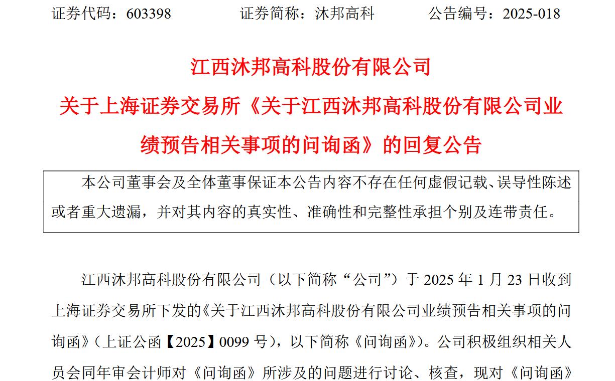 近日,经过3次延期后,江西沐邦高科股份有限公司(以下简称“沐邦高科”)终于就上交所关于其业绩预告的问询函作出了回复。
