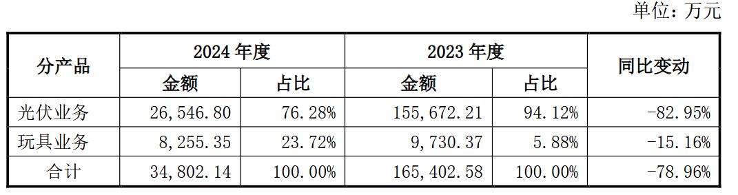 据悉,沐邦高科此前预计2024年业绩将出现大幅亏损。具体来看,沐邦高科的业务主要分为光伏和玩具两大板块。根据回复,2024年沐邦高科预计营业收入为3.48亿元,较2023年的16.54亿元大幅下滑78.96%。其中,光伏业务收入占比76.28%,但营收较上一年度下降了82.95%;玩具业务收入占比23.72%,营收同比下降15.16%。