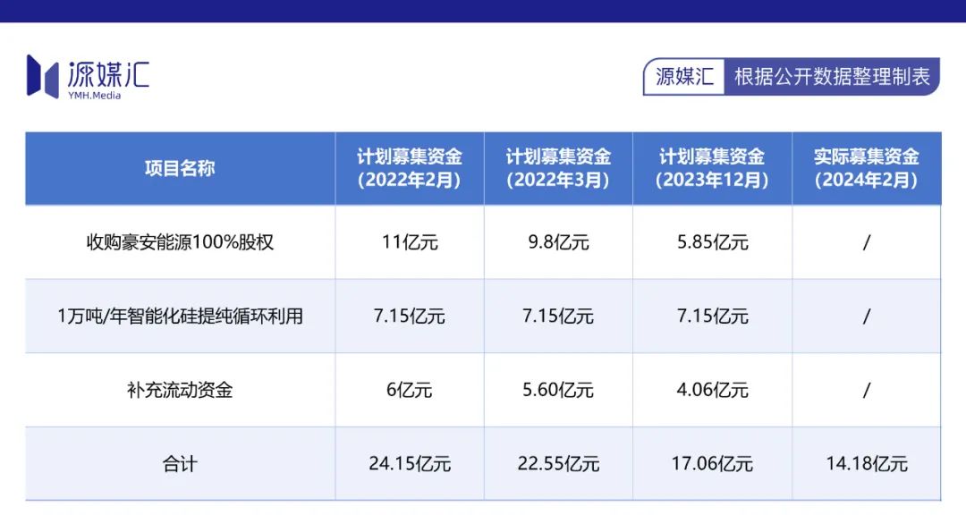 在决定收购豪安能源后不久,沐邦高科在2022年2月抛出了第一版定增计划,当时计划向特定对象发行股票,合计募集24.15亿元,用于收购豪安能源、 1万吨硅提纯和补充流动资金这三个项目。