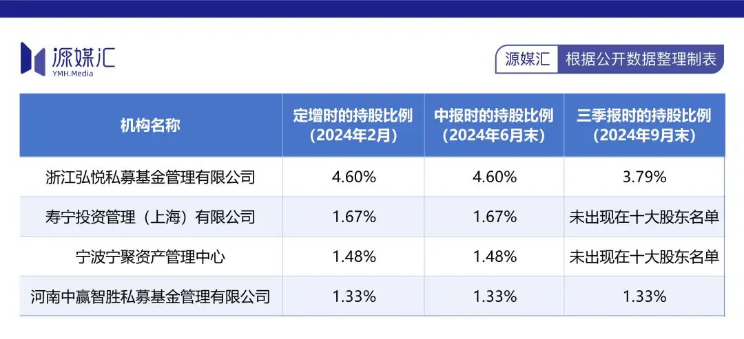 源媒汇通过对比沐邦高科定增公告、2024年中报以及三季报发现,浙江弘悦在2024年三季度时减持了0.81%的定增持仓;而寿宁投资和宁波宁聚这两家在2024年2月定增的机构,并未出现在沐邦高科三季度的十大股东名单里。这也意味着这两家机构在此期间进行了减持。