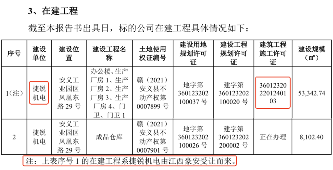 据*ST沐邦出具日为2022年4月15日的公告,截至2022年4月15日,内蒙古豪安的在建工程中,包括捷锐机电建设的“办公楼、生产厂房1、生产厂房2、生产厂房3、生产厂房4、门卫、门卫1”(以下简称“捷锐机电序号1工程”)、“成品仓库”,建设位置均为安义工业园区凤凰东路29号,建设规模合计为61,445.14㎡。其中,捷锐机电序号1工程系捷锐机电自江西豪安受让而来。