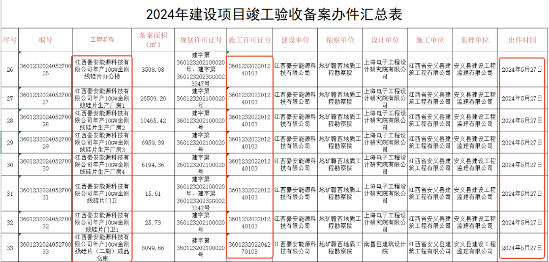 同时,据安义县住建局于2025年2月17日发布的《2024年建设项目竣工验收备案办件汇总表》,施工许可证号为360123202201240103、建设单位为江西豪安,对应包括工程名称为“江西豪安能源科技有限公司年产10GW金刚线硅片办公楼”、“江西豪安能源科技有限公司年产10GW金刚线硅片生产厂房1”等8项工程,出件时间为2024年5月27日。