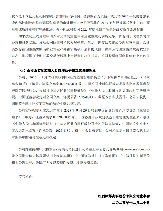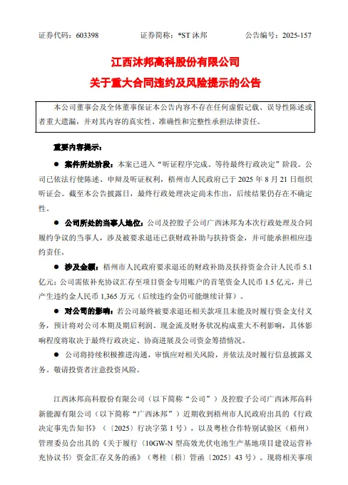 12月19日,*ST沐邦发布关于重大合同违约及风险提示的公告称,因项目长期未按约定进度推进且未能实现投产,梧州市人民政府于2025年7月1日向公司下发《梧州市人民政府行政决定事先告知书》((2025)行决字第1号),责令公司及相关子公司退还已获得的财政补助及扶持资金合计人民币5.1亿元,并承担相应违约责任。