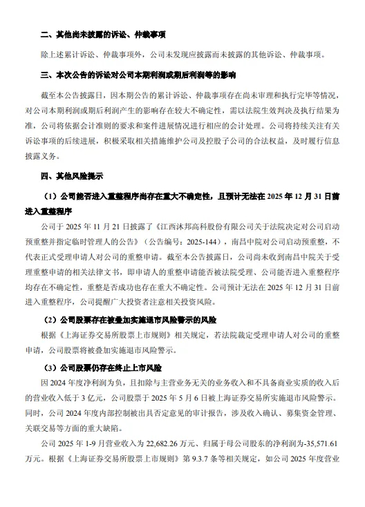 根据《上海证券交易所股票上市规则》第9.3.7条等相关规定,如公司2025年度营业收入低于3亿元且利润总额、扣非前后净利润三者孰低者为负值,或公司2025年度财务报表或内部控制被出具非无保留意见的审计报告,公司股票将在2025年年报披露后终止上市。