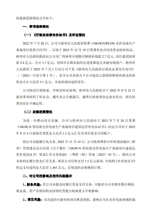据了解,2022年7月20日,公司与梧州市人民政府签署《10GW TOPCon光伏电池生产基地项目投资合同书》,后续于2023年12月19日签署补充合同及资金扶持协议。梧州市人民政府据此向公司及广西沐邦分别拨付财政补助款2.7亿元、项目建设扶持款2.4亿元,合计5.1亿元。