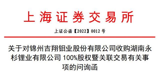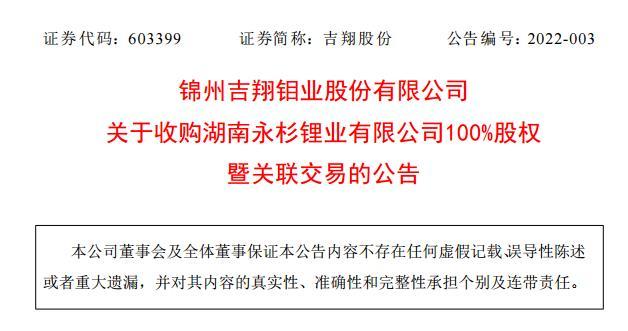 1月6日,吉翔股份(603399.SH)发布公告,拟4.8亿元收购关联方杉杉股份下属企业宁波永杉所持湖南永杉锂业100%股权。