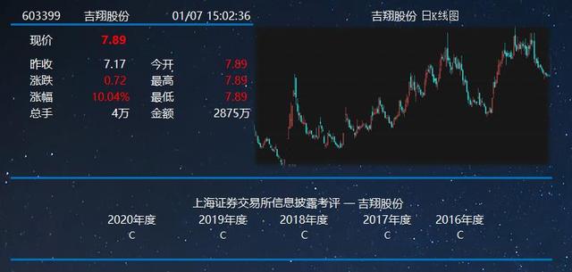吉翔股份于2012年8月24日在上交所主板上市。据投研电讯信披质量研究院统计,自上交所2016年度开展信息披露考评工作以来,吉翔股份在上交所近五个年度信息披露考评中均为C。