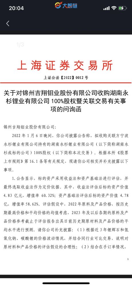 果不其然,杉杉股份刚刚发布完上述股权转让公告,旋即就收到了来自上交所的问询函。上交所要求吉翔股份就这次受让标的资产的评估价格合理性、标的资产是否具备完全的生产经营能力等诸多情况做出说明。