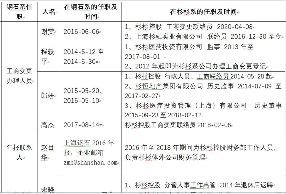 2、回函公告列举了极少数钢石系董监高人员,称其有任职但不参与杉杉系公司经营决策,亦或是杉杉控股的已退休人员。但据多方资料了解到,除列举人员外,上海钢石自2014年被吴军辉收购至今,其历任小股东、监事、财务、工商联络员全部是由杉杉控股的雇员连续担任。
