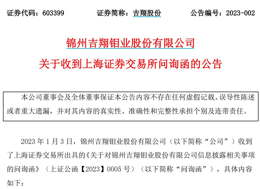 1月3日晚间,吉翔股份发布公告称,公司收到上交所问询函。