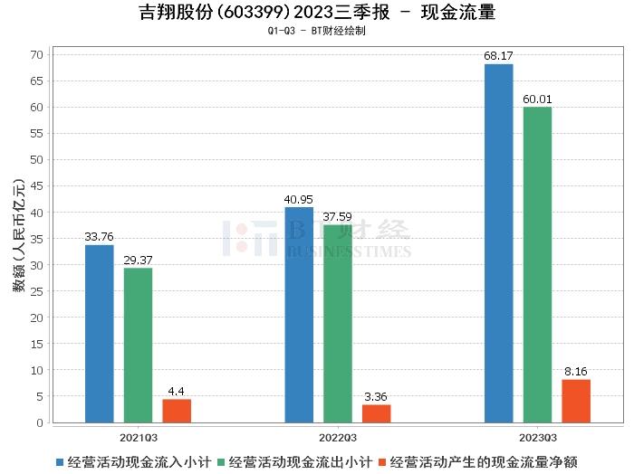 在现金流量方面,吉翔股份2023年三季度的经营活动产生的现金流量净额为8.16亿元,较上年同期的3.36亿元有较大增长。经营活动现金流入小计为68.17亿元,较上年同期的40.95亿元有所增长。经营活动现金流出小计为60.01亿元,较上年同期的37.59亿元有所增长。