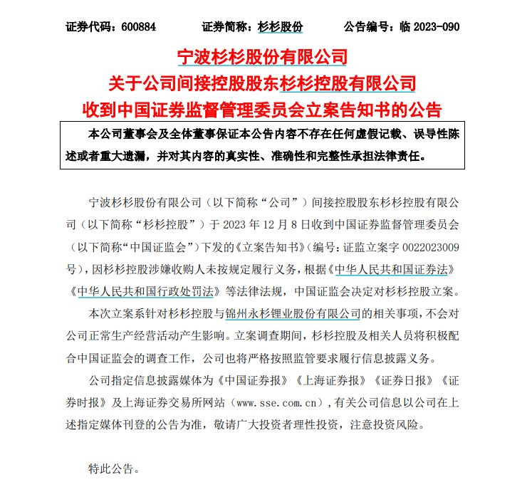 8日晚间,杉杉股份、吉翔股份公告,公司间接控股股东杉杉控股于2023年12月8日收到中国证监会下发的《立案告知书》(编号:证监立案字0022023009号),因涉嫌收购人未按规定履行义务,根据法律法规,中国证监会决定对杉杉控股立案。
