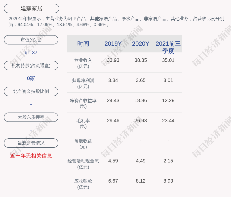 2020年年报显示,建霖家居的主营业务为厨卫产品、其他家居产品、净水产品、非家居产品、其他业务,占营收比例分别为:64.04%、17.09%、13.51%、4.68%、0.69%。