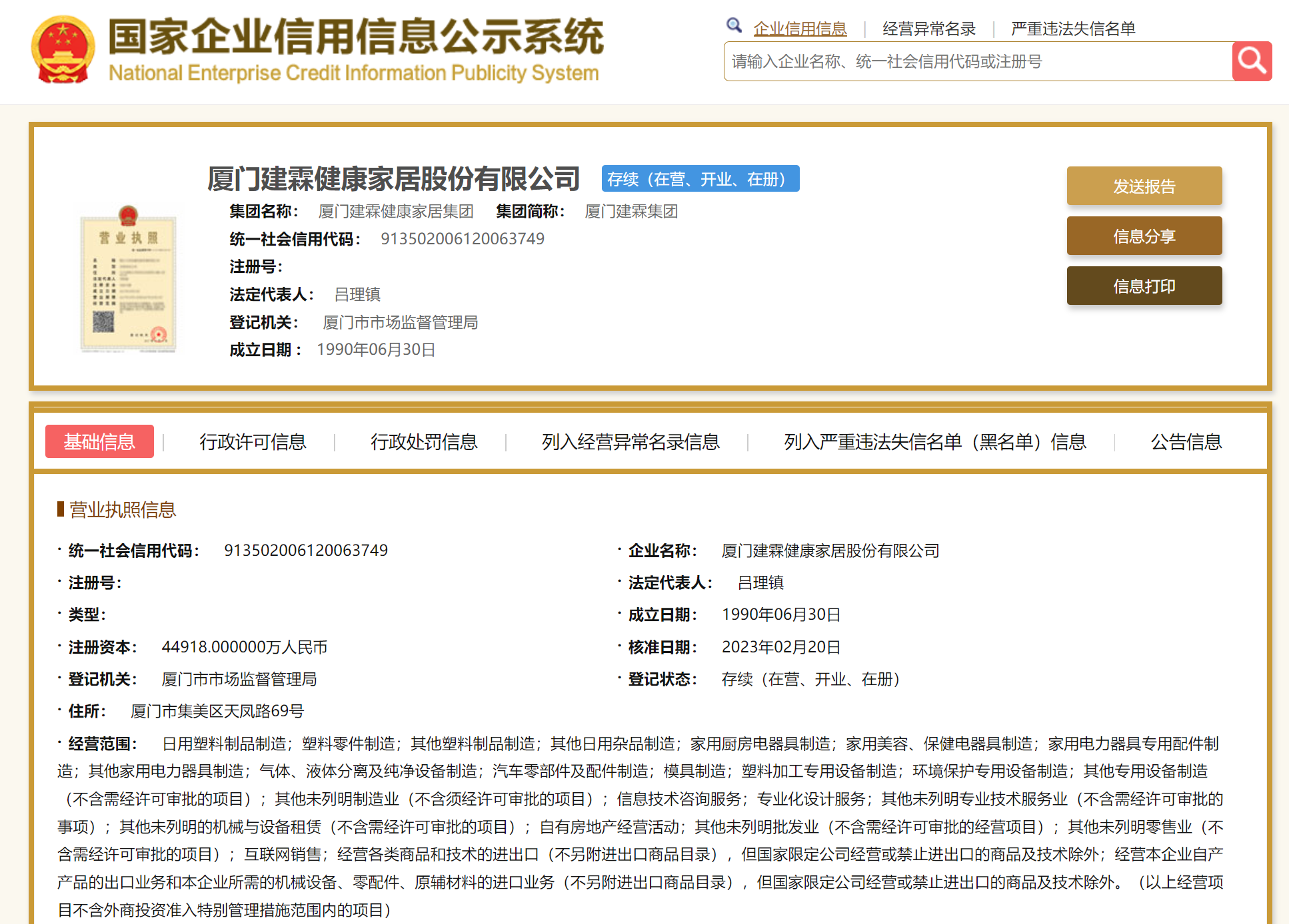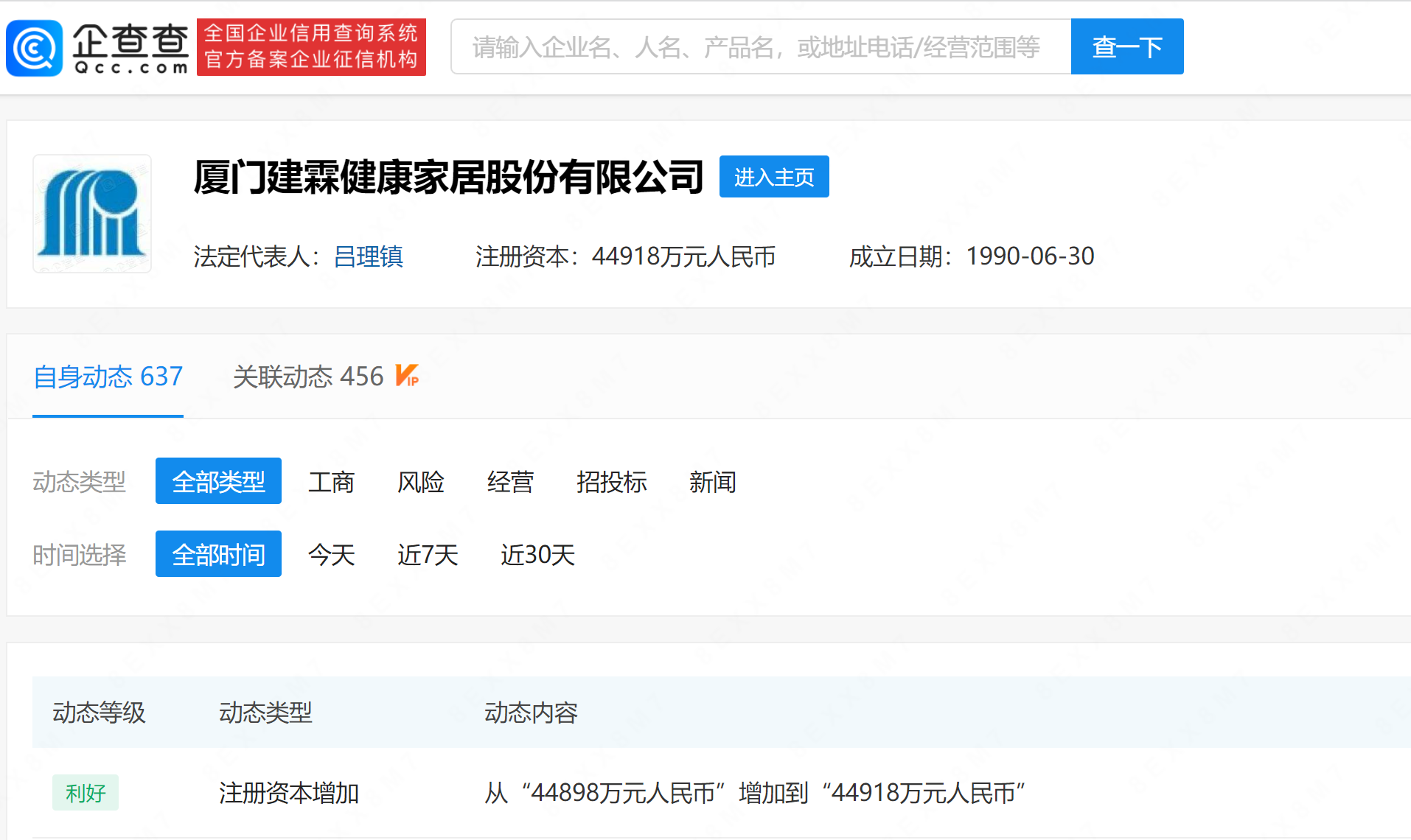 2月23日消息,厦门建霖健康家居股份有限公司(以下简称“建霖家居”)注册资本从“44898万元人民币”增加到“44918万元人民币”,增加约0.04%。