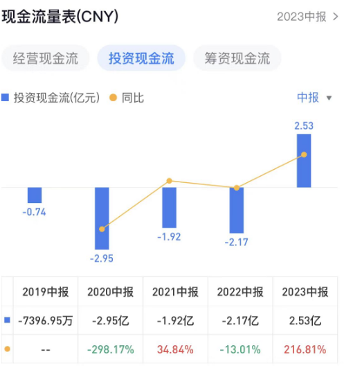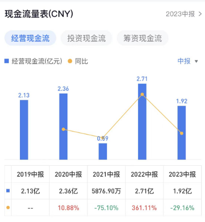 2023上半年,建霖家居经营现金流为1.92亿元,同比降29.16%;投资现金流为2.53亿元,同比增216.81%;筹资现金流为-2.73%。