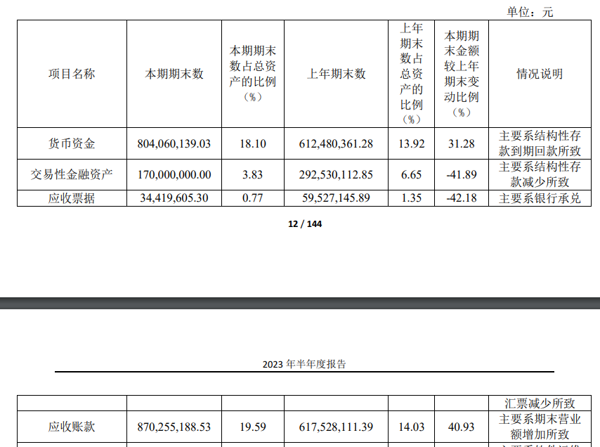 从资产及负债状况来看,2023上半年,建霖家居货币资金8.04亿元。交易性金融资产1.7亿元,同比降41.89%,主要因结构性存款减少所致。应收账款8.7亿元,同比增40.93%,占营收46%,主要因期末营业额增加所致。