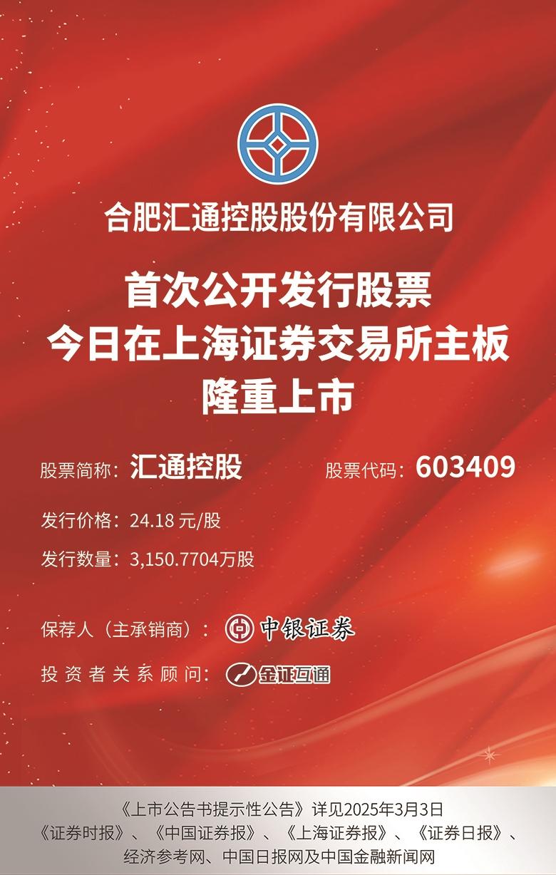 合肥汇通控股股份有限公司首次公开发行股票今日在上海证券交易所主板隆重上市