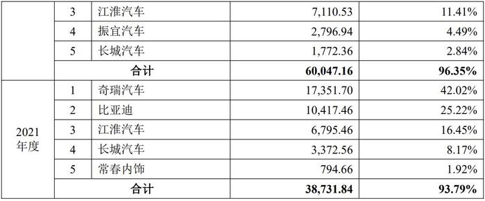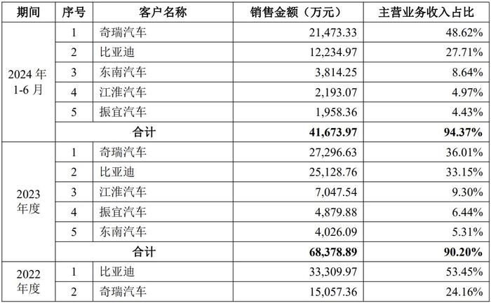 2021年、2023年度和2024年上半年,奇瑞汽车均为汇通控股的单一大客户。报告期内,该公司来自奇瑞汽车的收入分别约为1.74亿元、1.51亿元、2.73亿元和2.15亿元,占比分别约为42.02%、24.16%、36.01%和48.62%。