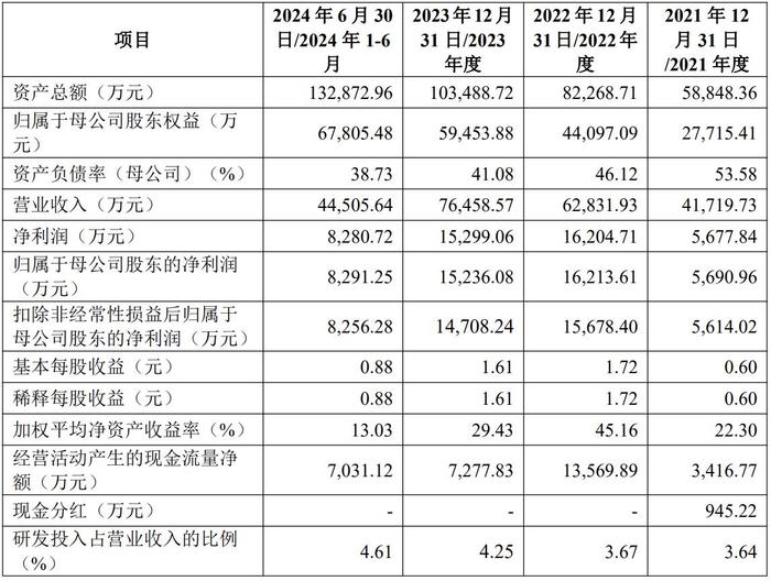 2021年、2022年、2023年和2024年上半年,汇通控股的营收分别约为4.17亿元、6.28亿元、7.65亿元和4.45亿元,净利润分别约5677.84万元、1.62亿元、1.53亿元和8280.72万元,扣非后净利润分别约5614.02万元、1.57亿元、1.47亿元和8256.28万元。