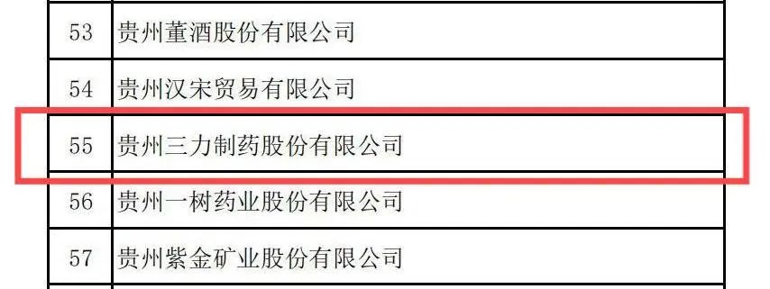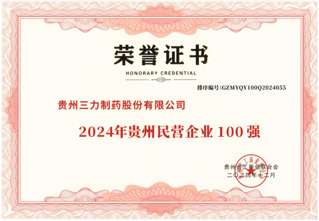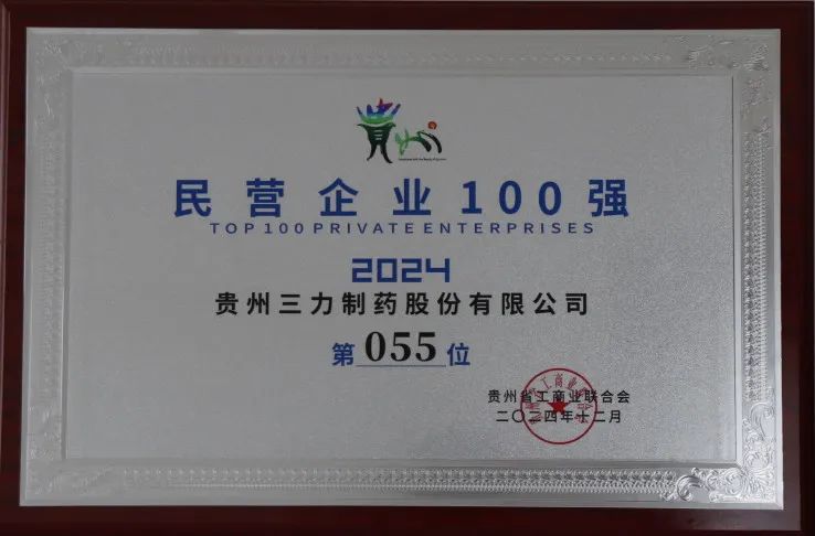12月26日下午,“2024贵州民营企业100强发布会”在贵阳空港生态酒店举行,贵州省工商业联合会发布2024贵州民企百强榜单和制造业20强榜单,并为百强和制造业20强代表企业颁发牌匾和证书。贵州三力制药股份有限公司?入选2024贵州民营企业100强,排名第55位。