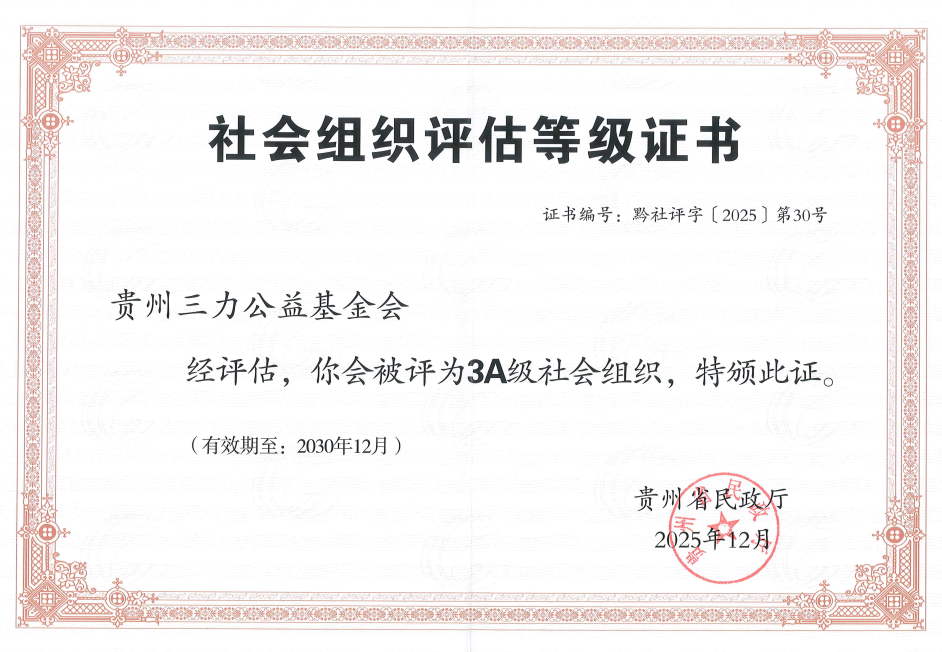 2025年12月, 贵州省民政厅 发布《关于对 贵州省律师协会 等63家社会组织评估结果的公告》,经自愿申报、资格审查、评估评价、终评公示等流程严格评审, 贵州三力 公益基金会获评 贵州省民政厅 AAA级社会组织称号!