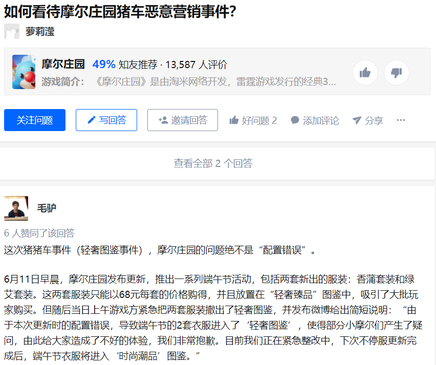 除去Bug频发以外。近期更有玩家爆料公司存在“骗氪”行为,起因是端午节《摩尔庄园》策划的一项消费活动。就在活动发布当天,临时新添加了两个价值68元的端午套装到轻奢臻品,导致集齐23套时装更容易了,就有玩家利用两个套装买到本不该轻易取得的商品。