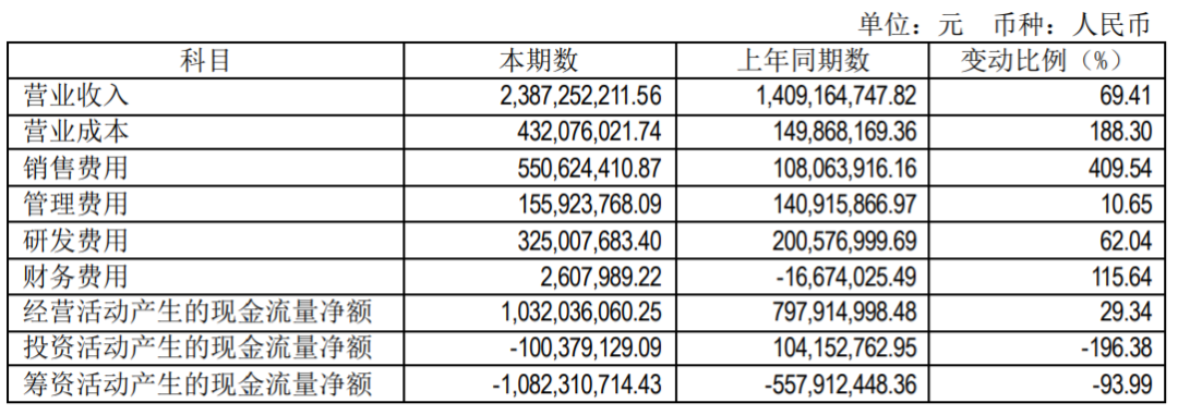 在支出方面,吉比特报告期内营业成本约为4.32亿元,同比增长188.3%;销售费用约为5.51亿元,同比增长409.54%;研发费用约为3.25亿元,同比增长62.04%。
