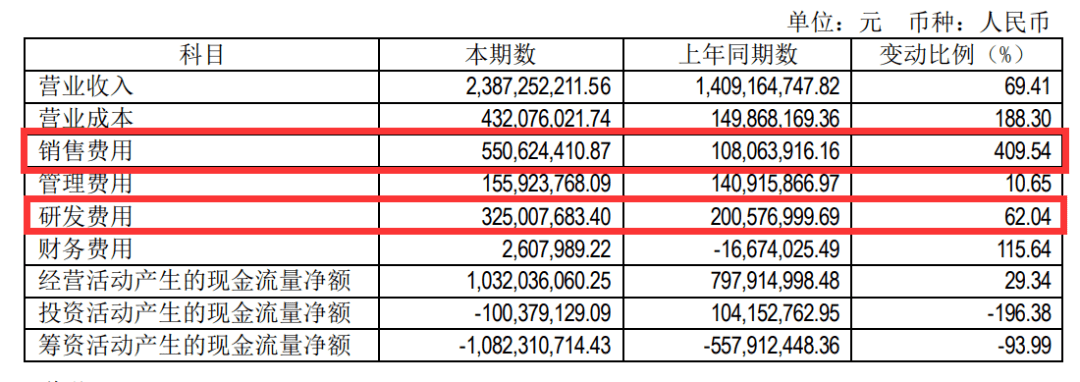 需要注意的是,除了营收与净利润数据表现亮眼之外,今年上半年,吉比特财报中有两项数据也值得关注:一是销售费用,今年上半年,吉比特的销售费用同比大涨409.54%至5.5亿元;二是研发费用,同比增长62.04%至3.25亿元。