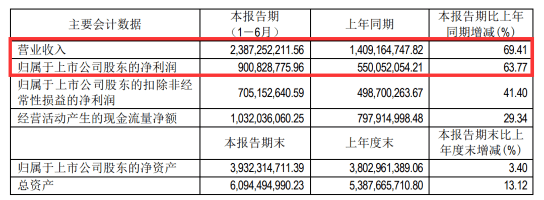 财报显示, 2021年上半年,吉比特营收约23.87亿元(人民币,下同),同比增长69.41%;归属于上市公司股东的净利润约9.01亿元,同比增长63.77%;基本每股收益盈利12.54元,同比增长63.49%。
