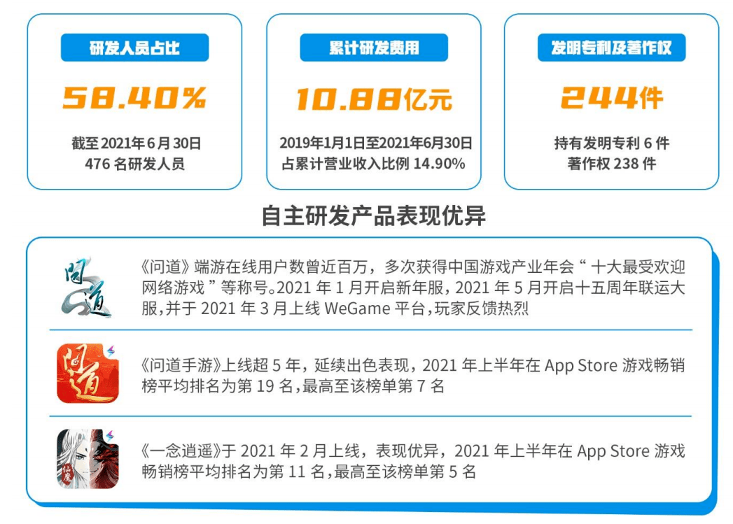 游戏产品表现优秀,其中,《问道》《问道手游》《一念逍遥》《不思议迷宫》等经典产品均为其贡献稳定的流水。而今年上线的《摩尔庄园》《鬼谷八荒》PC 版也有不错的表现。