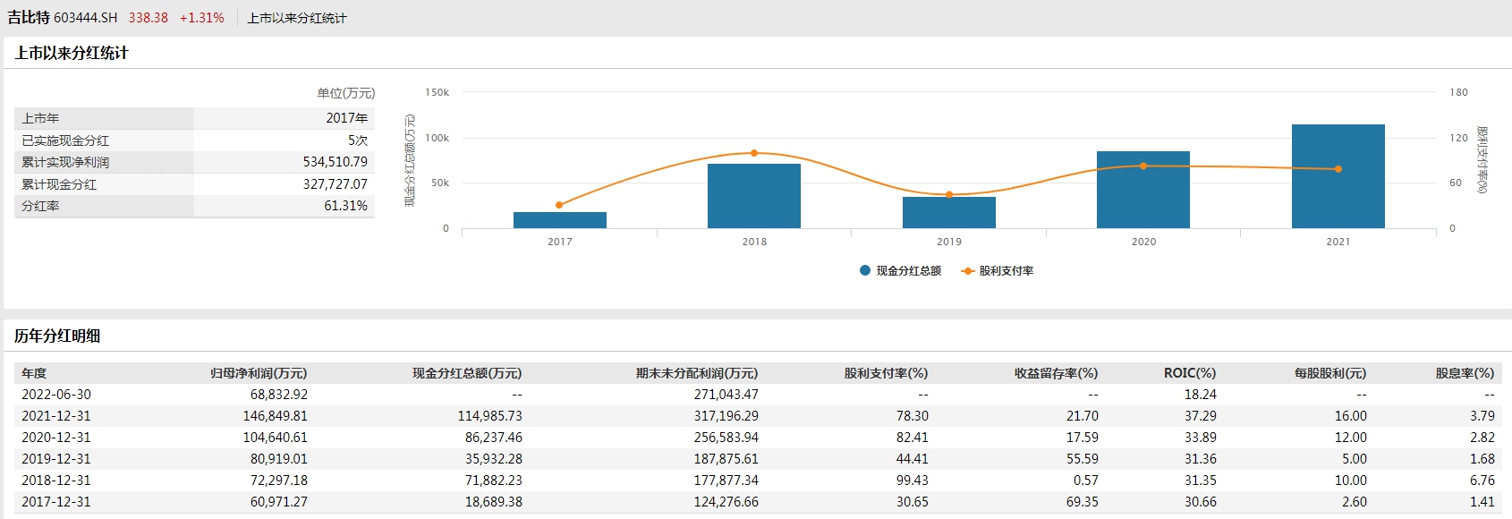 数据显示,吉比特在分红方面一直“大手笔”。自2017年上市以来,吉比特累计分红5次,2017年至2021年,吉比特的分红比例分别为30.65%、99.43%、44.41%、82.41%和78.3%。