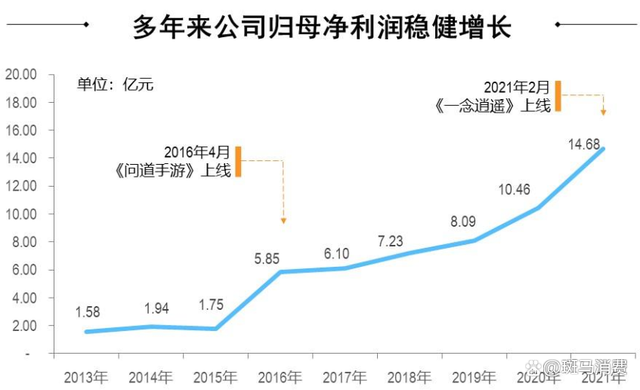 2021年,前有《问道手游》继续开路,后有当年2月上线的《一念逍遥》新手发力,公司当年业绩大爆发,营业收入46.19亿元,同比增长68.44%,归母净利润同比增长40.36%至14.68亿元。