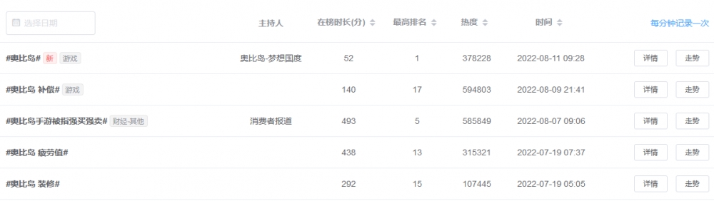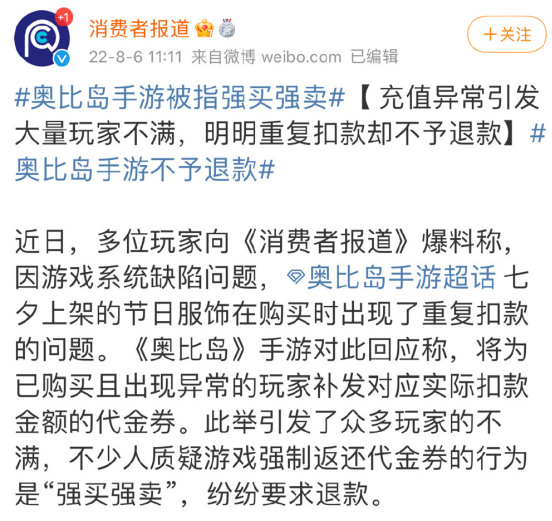 该话题词创建者为消费者报道,于8月7日被顶到热搜第5名,在榜时长将近8个多小时。消费者报道认为,其收到多名玩家爆料,《奥比岛》因游戏系统缺陷问题,在七夕活动期间出现了玩家重复扣款的情况,而官方的补偿方式则是为重复扣款的玩家发放相应数额的代金券,并非直接退款,从而引发了玩家众怒。