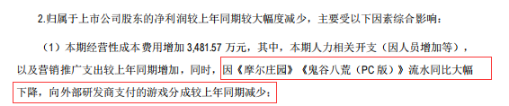 财报列举了多条净利润减少的原因,第一条则为营销推广支出较上年同期增加,同时,因《摩尔庄园》《鬼谷八荒(PC 版)》流水同比大幅下降,向外部研发商支付的游戏分成较上年同期减少。