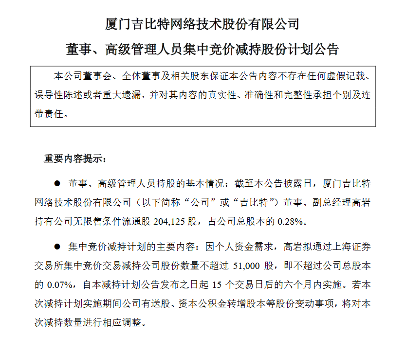 在8月19日晚,吉比特发布《董事、高级管理人员集中竞价减持股份计划公告》,公告称,因个人资金需求,吉比特董事、副总经理高岩拟通过上海证券交易所集中竞价交易减持公司股份数量不超过51,000股,即不超过公司总股本的0.07%,自减持计划公告发布之日起15个交易日后的六个月内实施。