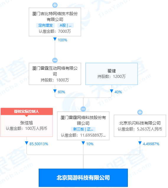 工商信息显示,简游科技由张佳旭成立于2021年1月,公司在2021年8月和2022年6月分别接受了北京乐闪科技有限公司和厦门雷霆网络科技股份有限公司的投资。股权穿透后可以发现,厦门雷霆网络科技股份有限公司(以下简称“雷霆股份”)目前持有简游科技10%的股份,厦门雷霆互动网络有限公司(以下简称“雷霆互动”)持有雷霆股份60%的股份,而雷霆互动为吉比特(603444.SH)全资子公司。