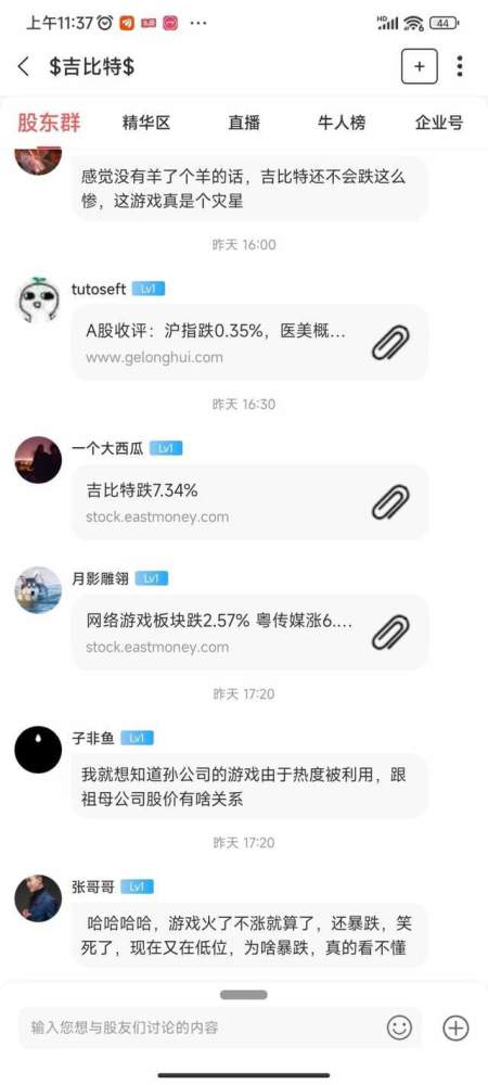 在尺度吉比特股东群,有投资者表示,“游戏火了不涨就算了,还暴跌,真是看不懂。”“没有羊了个羊的话,吉比特还不会跌这么惨。”还有投资者表示,这游戏火了不多久,多半是昙花一现,资金都没有炒作的欲望。