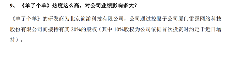 纪要显示,公司已按照先前的投资约定,于近日增持《羊了个羊》研发商北京简游10%的股份,目前吉比特已间接持有该公司20%的股份。