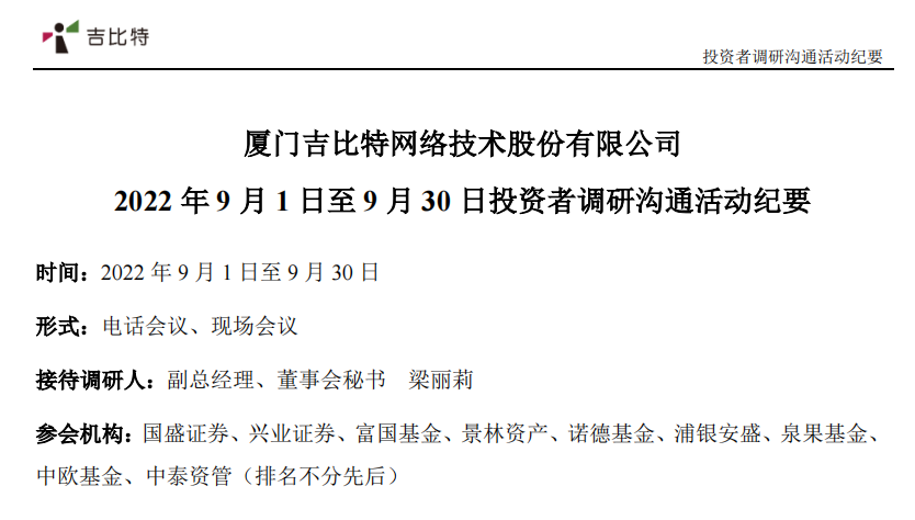 10月10日,厦门吉比特网络技术股份有限公司发布了《投资者调研沟通活动纪要》(2022年9月1日至9月30日)。