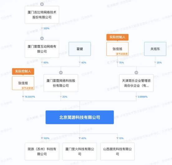 穿透股权可知,厦门雷霆网络科技股份有限公司由A股上市公司吉比特间接控股。变更记录显示,厦门雷霆网络科技股份有限公司于2022年6月入股北京简游,持有其20%股份,为该公司的第二大股东。